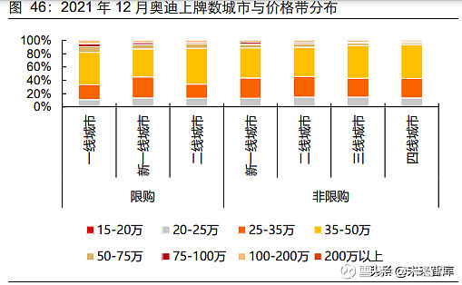 奥迪定位高端,高消费能力城市销售能力领先。奥迪产品价格带跨度较大,15 万以上都 有相应产品。从上牌数结构来看,奥迪 25-35 万的 A3 和 35-35 万的 A4、Q5 为上牌主 力。上牌数结构在各等级城市较为稳定,50 万以下车型占比在各城市级别中均在 80% 以上。从销售能力来看,奥迪销售能力受城市级别影响明显,随着城市消费能力的下降, 奥迪的销售能力下降明显,在非限购城市的销售能力分别为 1321、1105、876、520 台 /家。