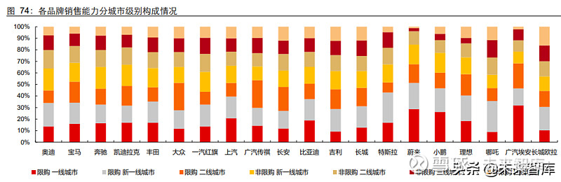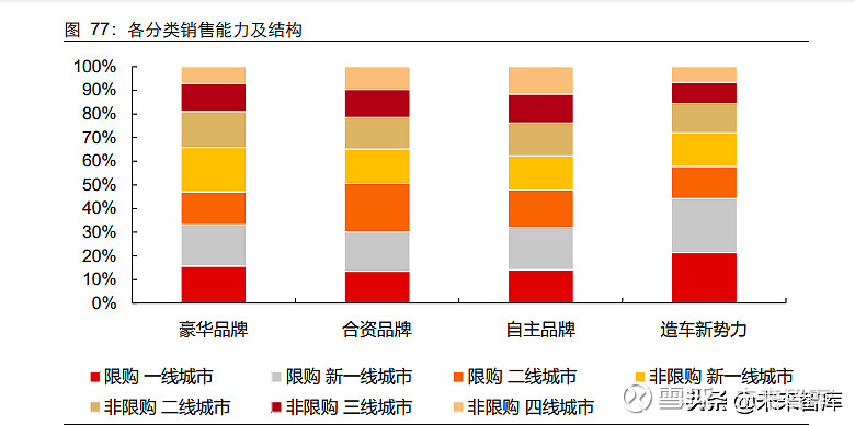 造车新势力销售能力更加依赖限购政策与城市消费能力。横向来看,价格区间较高的豪 华品牌和造车新势力的销售能力较为关注消费能力较强城市的销售能力,二线及以上城 市销售能力占比分别为 81%和 84%。主力价格区间相近的合资品牌与自主品牌的销售 能力构成较为相近。受益限购政策的造车新势力的销售能力构成中,限购城市的销售能 力占比为 58%,相比于其他分类更高。