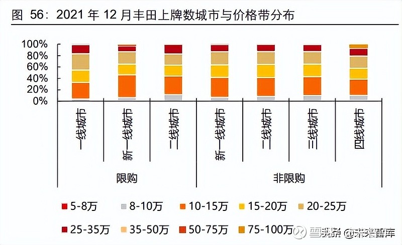 丰田产品分布全面,销售能力受城市级别影响。丰田的产品覆盖 5-100 万价格区间,较 为广泛。从上牌数结构来看,以 10-15 万的卡罗拉和雷凌、15-20 万的丰田 RAV4 和威 兰达、20-25 万的凯美瑞和亚洲龙为主,三者在限购的新一线城市的上牌数占比之和为 78%,上牌数结构受城市级别影响较小。从销售能力角度来看,品牌认可度较高的丰田 销售能力受限购政策与城市级别影响,在非限购城市的销售能力分别为 1341、1105、 1018、749 台/家。