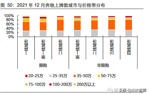 奔驰定位中高端,销售能力受城市级别影响较大。从价格带角度来看,奔驰在 20 万以 上都有相应产品。从上牌数结构来看,以 25-35 万的奔驰 C 级和奔驰 GLB 与 35-50 万 的奔驰 E 级和奔驰 GLC 为主,在限购城市上牌数结构受城市等级影响,随城市等级下 降,50 万以上产品上牌数占比收窄,35-50 万产品上牌数从 43%上升至 52%;在非限 购城市上牌数结构稳定。从销售能力来看,受城市等级影响,在非限购城市的销售能力 分别为 1148、888、765、463 台/家。
