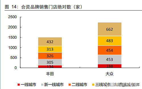 合资品牌中大众领先丰田,品牌布局相似。从总数来看,大众、丰田绝对数都有较高水 平,大众领先丰田。分城市级别来看,由于四线城市数量较多,绝对值上四线城市具有 领先性。从一线、新一线、二线和三线城市对比来看,后三者呈现布局的均匀性。丰田 的新一线、二线和三线城市门店数量分别为 305、326 和 313 家,大众的门店数量分别 为 453、454 和 483 家,数量差距明显。从门店结构化数据来看,四线城市占比大于新 一线、二线和三线城市。