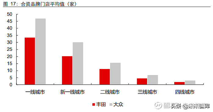 合资品牌渠道成熟,布局均匀。从平均门店数和结构数来看,合资品牌布局方式相似性 较高,关注有一定消费能力的城市。一线城市布局力度最大,新一线次之。相较于豪华 品牌,合资品牌在一线城市占比较低而在新一线城市占比较高,显现出一定的差异化布 局。同时,对比豪华品牌和造车新势力,丰田、大众在三线城市平均门店数分别为 5、 7 家,在四线城市平均门店数分别为 2、3 家,远高于豪华品牌和造车新势力的对应门 店数,体现出合资品牌在三四线城市的渠道优势和成熟性。