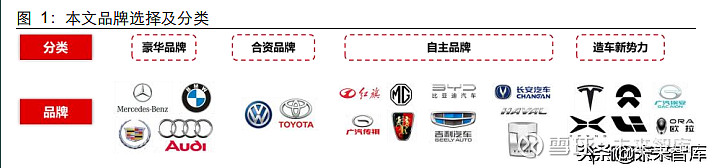 品牌分类方式: 1)豪华品牌,奔驰、宝马、奥迪、凯迪拉克有着长久的发展历史,价 格带集中在 30 万以上,作为豪华品牌的代表。2)合资品牌,大众和丰田作为国际成熟 车厂的优秀代表,深耕国内市场多年,有着良好的消费者基础。2 3)自主品牌,一汽、 上汽、广汽、比亚迪、长城、长安、吉利作为自主的优秀代表,其旗下品牌众多,销量 规模可观,其中,一汽选择一汽红旗、广汽选择广汽传祺、上汽选择荣威和名爵、长城 选择哈弗作为代表,在后续的过程中多品牌车企进行加和计算门店数和销售能力。4) 造车新势力,特斯拉、蔚来、小鹏、理想、哪吒,作为整车厂领域的新进入者,目前已 经脱颖而出成为新势力中的领跑者;以及自主品牌中广汽探索性品牌广汽埃安、长城新 能源品牌欧拉,作为独立运营新品牌的代表。