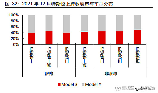 特斯拉定位高端,一线、新一线城市销售能力较强。从价格带来看,特斯拉主要定位 25- 35 万元价格带。从上牌数的结构来看,在非限购地区随着城市级别的下降,Model 3 的 占比有所提升,从新一线城市的 43%上升到四线城市的 51%。从销售能力来看,特斯 拉在一线、新一线城市的销售能力较强,在限购和非限购的新一线城市销售能力分别为 2310、1384 台/家。由于在三线城市门店较少,三线城市的销售能力表现偏高,销售能 力为 1197 台/家。在四线城市中,特斯拉销售能力下降明显,为 417 台/家。