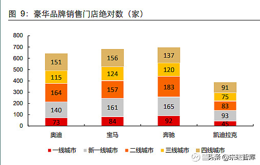 豪华品牌中 BBA 较为突出,门店分布成熟度较高,品牌布局相似度高。从总数来看, 豪华品牌奔驰、宝马、奥迪门店总数均在 600 家以上,并且领先于仅有 387 家的凯迪拉 克。分城市级别来看,豪华品牌在各城市级别中门店布局平衡,新一线城市、二线城市 门店数在各城市级别中领先,奔驰、宝马、奥迪门店数在 300 家左右。从绝对值结构化 数据来看,豪华品牌在各个城市门店布局水平基本一致。