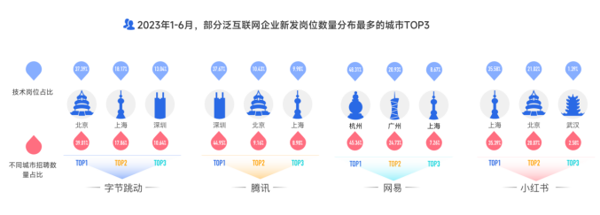 字节跳动、腾讯、小红书、网易的人才招聘在地区间相对较为均衡,总部所在地招聘人才占比未超过50%。小红书除了在总部上海招聘技术人才外,还广泛吸纳北京的技术人才,字节跳动同样扩大在上海的技术招聘力度。