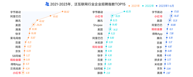 2021年,字节跳动、阿里巴巴、腾讯等大厂的新发岗位量断层领先,但2023年大厂的新发岗位量下降明显,处于快速发展期的新一线厂商仍保持着稳定上升的招聘量。其中,小红书的招聘指数从2021年的第15名提升到2022年的第2名,且在2023年继续保持第2的位置,仅次于字节跳动;蚂蚁金服和美团的招聘指数相对稳定,一直保持的前5名之列。