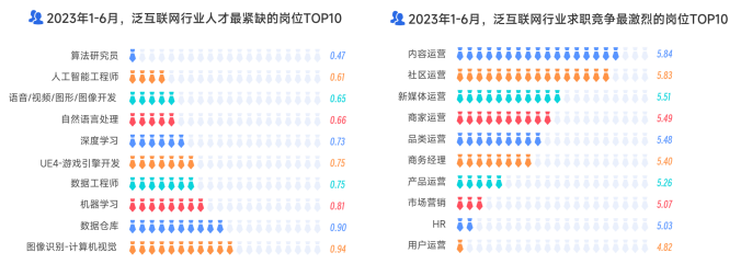 从不同岗位的人才供需比来看,高技术人才保持了紧缺态势。2023年上半年,泛互联网行业最紧缺的岗位主要集中在AI方向,运营岗位人才求职竞争激烈。算法研究员以0.47的人才供需比位居人才紧缺度榜首,平均2家公司争夺1位人才。AI技术的爆发也推动了人工智能工程师、自然语言处理、深度学习等AI方向人才的招聘需求,这三个岗位的人才供需比分别为0.61、0.66、0.73。