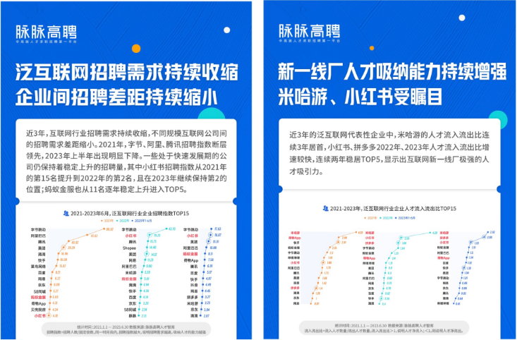 从投递量来看,互联网厂商获得从业者投递量的排名发生明显变化。2021年,被投递最多的泛互联网公司前列为字节跳动、阿里巴巴等大厂。2022年开始,以小红书为首的新一线厂的投递量显著上升,大幅提升9个名次,超越腾讯、网易跃居至第3,2023年位次保持在第4。米哈游、得物等公司也出现在热投榜单,进入与传统大厂的抢人行列。