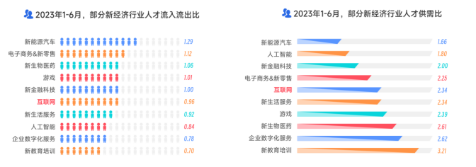 《报告》显示,2023年上半年,纯互联网行业求职难度创新高,人才供需比持续上升,达到2.34,平均约5个人才竞争2个岗位。同时,互联网行业出现明显的人才溢出现象,人才流入流出比为0.96。52.31%的从业者换行进去进入其他领域,比2022年增加2.27%。转行去电商零售行业的人才占比最高,为12.83%;其次是新生活服务行业(6.63%)和游戏行业(6.44%)。