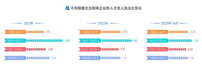 值得关注的是,万人以上规模大厂人才开始净流出,流入流出比从2021年的1.24下降至2023年的0.97。大厂由于进入发展平稳期,暂停人员规模的扩张;千人规模公司连续三年人才流入流出比大于1,处于人才净流入态势。