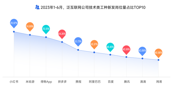 从泛互联网代表性企业新发岗位中技术岗的占比来看,小红书以78.97%的技术岗占比位列榜单第一,其后依次是米哈游(74.99%)、得物(70.15%)。阿里巴巴以50.37%位列第六,腾讯以43.16%位列第八。