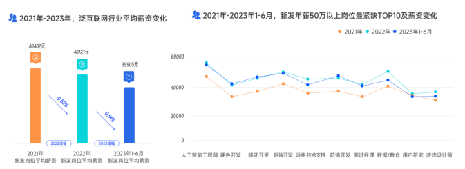 与此同时,互联网行业平均薪资连续三年小幅度下降,2023年上半年平均月薪约为39905元。但AI人才、高技术人才仍然炙手可热,薪资连续三年逆势攀升。