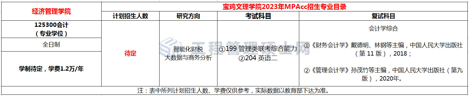 宝鸡文理学院2023年会计硕士(MPAcc)计划招生人数待定,学制待定,学费1.2万/年。