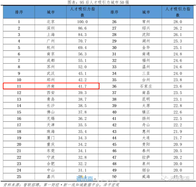 人口是经济社会活动的基础,青年人才更是第一资源,随着人口红利消逝、人才价值日益凸显。日前,泽平宏观和智联招聘联合推出《中国城市95后人才吸引力排名》报告,发布了中国95后人才吸引力城市50强,指出95后更青睐省会城市。其中济南在95后人才吸引力城市50强位列第11位,居山东第一,距离前十仅一步之遥。
