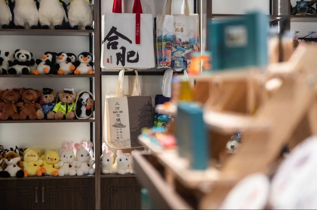 三河有礼文创店在软装上凸显了浓郁的中国风,进门处和店内顶部四周的花纹,是中国古代建筑上的装饰图案。店内设置了我把肥西送给你专柜(农产品),富光杯专场,及文创打卡盖章,店内集成了三河本地非遗产品,三河羽扇等。自行开发的文创产品涵盖三河的地标、民俗、非遗、文化符号,通过创意设计,将传统文化融入家居、日用、文具等生活的方方面面,让人爱不释手,频频“出圈”。