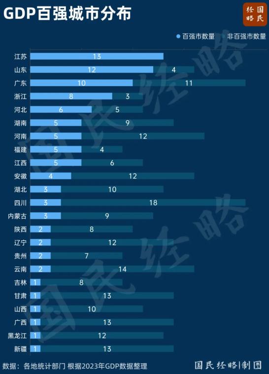 广东只有10个百强市,而江苏、山东分别坐拥13个和12个。
