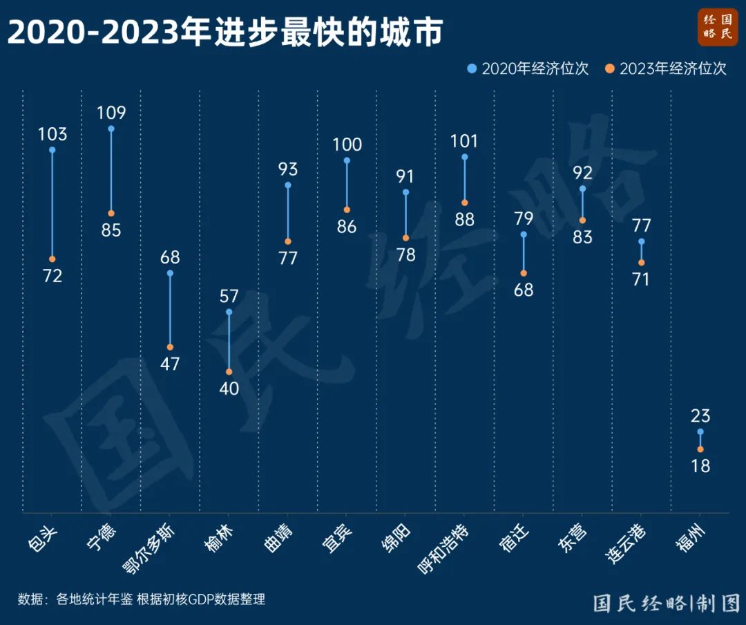 过去一年,内蒙古呼和浩特、包头分别上升10名、9名,四川宜宾上升9名,成为城市竞争的最大赢家。