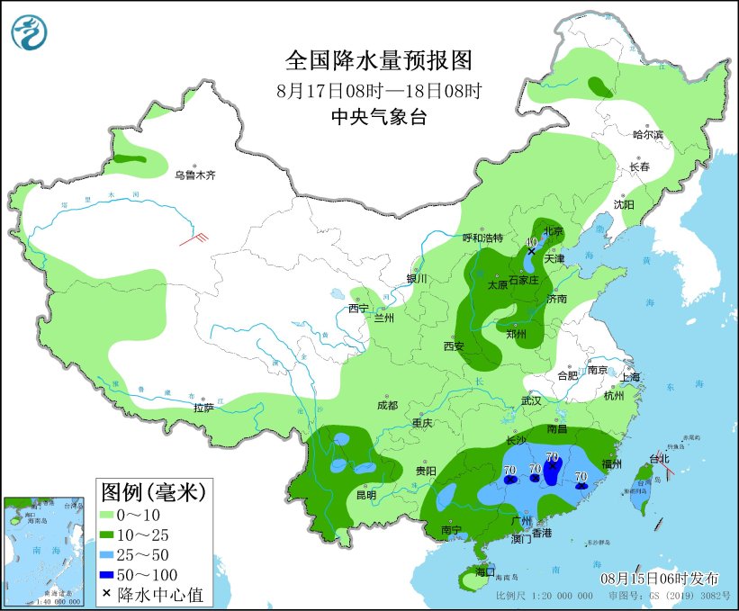 8月17日08时至18日08时,华北中南部、陕西东部、黄淮西部、江南中南部、华南、四川南部、云南大部、台湾岛等地部分地区有中到大雨,其中,湖南南部、江西南部、福建南部、广东北部等地局地有暴雨(50~70毫米)。新疆南疆盆地部分地区有5~6级风(见图4)。