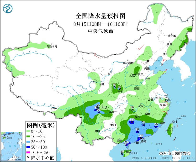 预计,8月15日08时至16日08时,陕西关中地区、川西高原中南部、四川盆地西南部、湖南南部、江西南部、福建南部、广东大部、广西东部、海南岛北部和西南部等地部分地区有大到暴雨,其中,湖南南部、广东南部沿海等地局地有大暴雨(100~140毫米)。上述部分地区伴有短时强降水(最大小时降雨量20~50毫米,局地可超过60毫米),局地有雷暴大风等强对流天气。中央气象台8月15日06时继续发布暴雨蓝色预警。