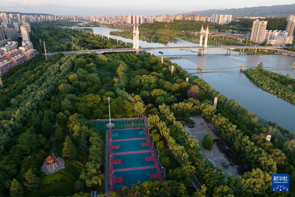 宝鸡市区渭河沿岸建设的运动休闲空间(5月9日摄,无人机照片)。
