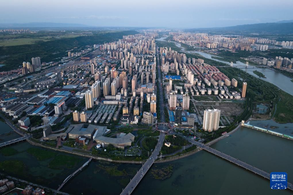南倚秦岭、北靠台塬的宝鸡市区景色(5月9日摄,无人机照片)。