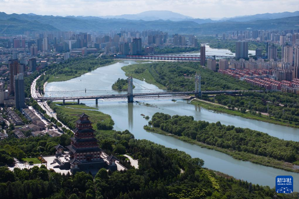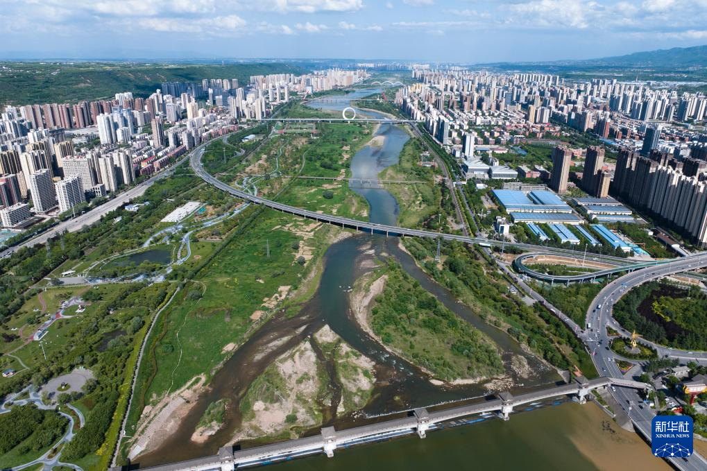 宝鸡市区渭河沿岸景色(5月9日摄,无人机照片)。