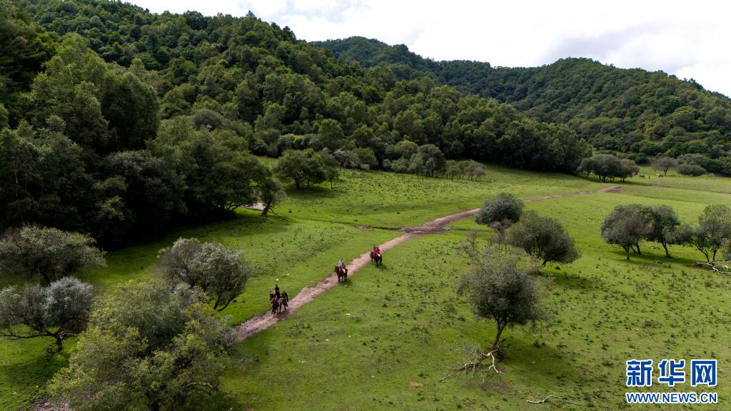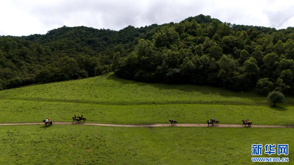 8月3日,游客在关山草原景区的一处马场骑马(无人机照片)。