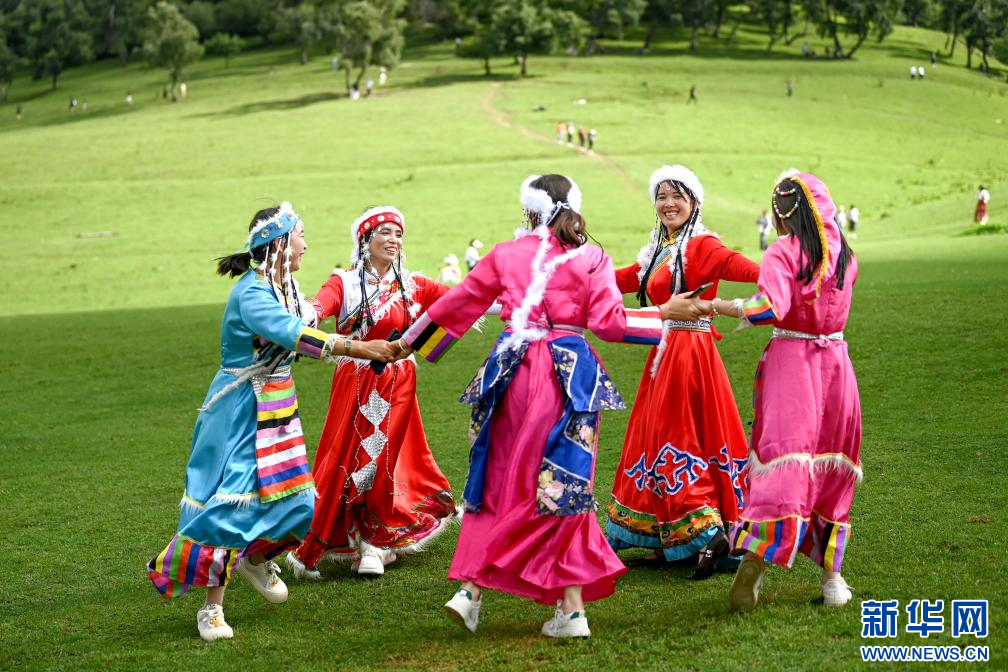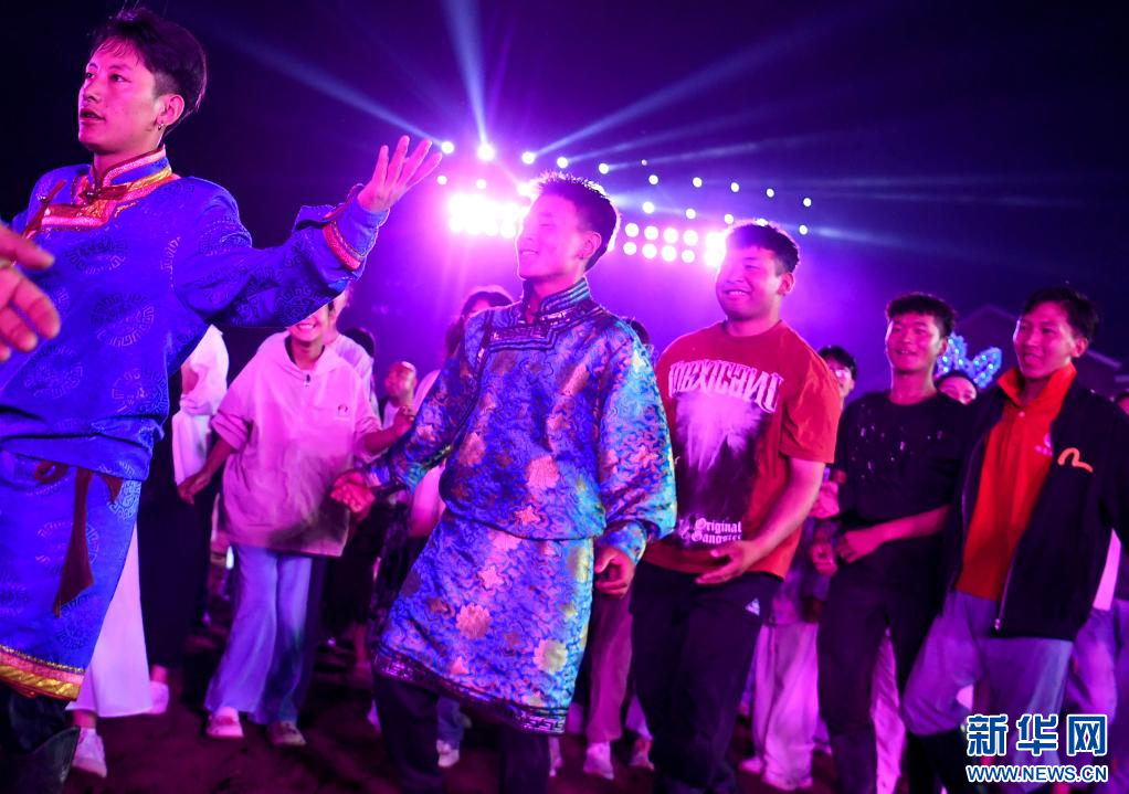 8月2日,游客在观看关山草原景区实景演艺《大秦关山》后参与集体联欢。