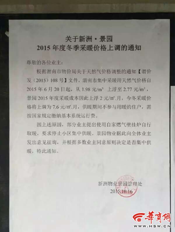 以上通知中都明确提到:根据渭南市物价局关于天然气价格调整的通知【渭价发(2015)108号】文件,渭南市集中采暖天然气价格自2015年6月20起,从1.98元/㎡上浮至2.77元/㎡。涨幅39.89%。