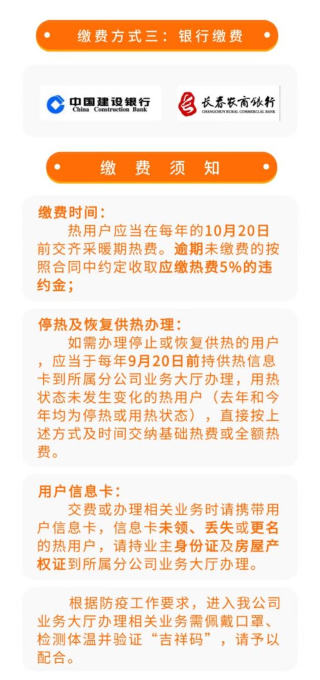 全款用热用户请于10月10日之前携带现金、用户信息卡到长春市建设银行交费,也可通过微信输入热力号(合同号)直接交费,公司窗口只办理停栓开栓业务。