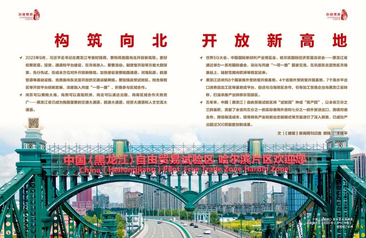 ◇2023年9月,习近平总书记在黑龙江考察时强调,要构筑我国向北开放新高地。更好统筹贸易、投资、通道和平台建设,在市场准入、要素流动、制度型开放等方面大胆探索、先行先试,形成全方位对外开放新格局。加快建设重要陆路通道、河海航道、能源管道等基础设施,完善面向东北亚开放的交通运输网络。要加强自贸试验区、综合保税区等开放平台创新发展,深度融入共建“一带一路”,积极参与区域合作。