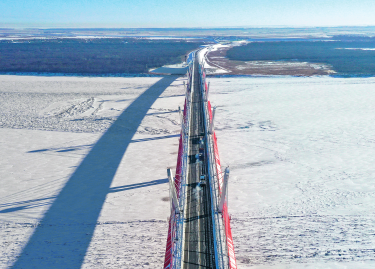 车辆行驶在黑河-布拉戈维申斯克黑龙江大桥上(2024 年 1 月 30 日摄)谢剑飞摄 / 本刊