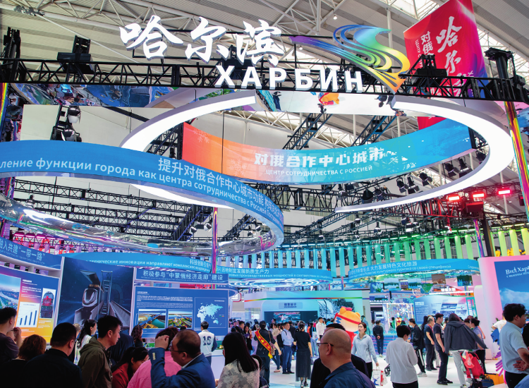 人们在第八届中俄博览会哈尔滨市展区内观展(2024 年 5 月 18 日摄) 张涛摄 / 本刊