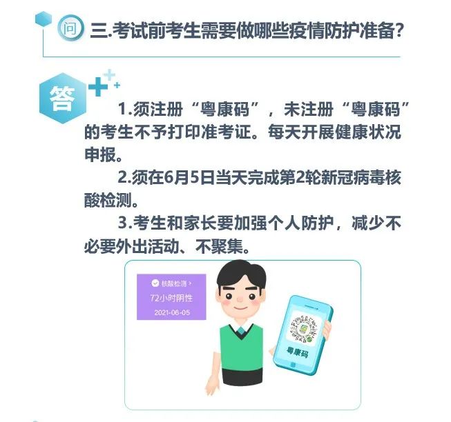 广州市卫生健康委员会负责人表示,将对全体考生和考务人员,首先进行14天的健康监测和健康状况、旅居史的申报, 分别于5月31日前和6月5日组织全员进行两轮新冠病毒核酸检测,守好基本底线。