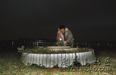 在一个小水池旁,周建宁借助手电筒的光亮来观测当天水的蒸发量