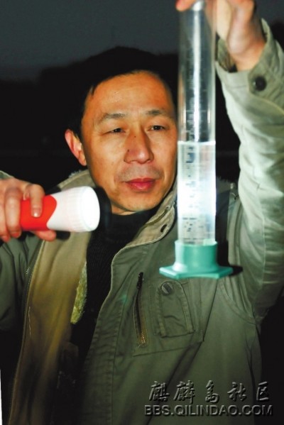 之后他又走到边上的雨量筒旁,将雨量筒中收集的雨水倒入量杯,两只手不够用,就用嘴巴咬住手电筒,腾出手记录着。