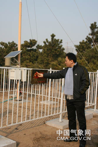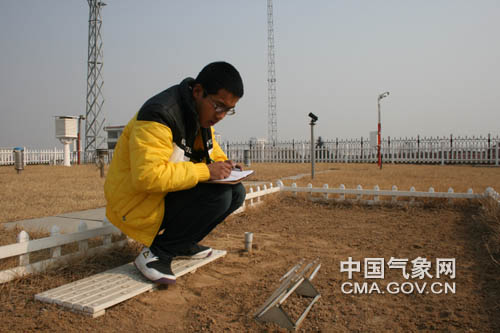 记者走进海阳市气象局。当天上午的值班测报员孙鹏程在观测场记录地温。苗艳丽 摄影