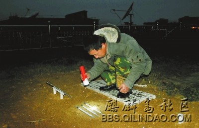 再次“溜”过一段“冰路”,可以看到一片平坦的草地和几排百叶箱等设备。一位瘦瘦的中年人手里拿着个“小玩意”,正在仔细观测。这里是贵阳国家基准气候站,担负着提供贵阳地区地面气象信息的任务。中年人叫薛晓光,是气候站的副站长。“我手里的是轻便风向风速仪,上面的箭头是风向,下面的读数是风速。今天有一个风向风速仪被冻住了,只能使用这个。”薛晓光向记者介绍,百叶箱里的温度计可以记录最高和最低温度,地上的温度计则是记录地表温度。“这是模拟电线积冰观测的。”他指着面前两个拉着晾衣绳似的金属线的铁架子说,“电线原始直径已知,用游标卡尺测量现在的直径,和已知直径相减,就能知道积冰厚度,主要是提醒电力部门注意积冰对输电线路的影响。”薛晓光说话时总带着亲切的笑容。