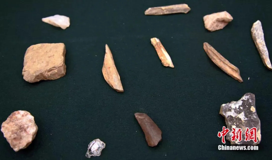 水帘洞遗址出土的旧石器石制品及动物遗骨。中新社记者 翟羽佳 摄