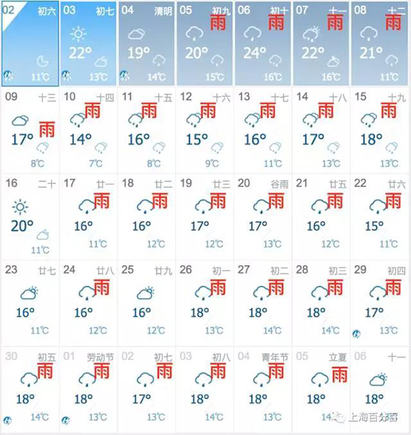4月3日、4日,关于“上海这天气又要作妖了!过了明天,全被雨承包!”的文章被广泛转发,短时间内快速传播。该网帖中的一张图表显示,自4月5日至5月5日,除了4月16日、23日、25日这三天外,其他时间均有雨。
