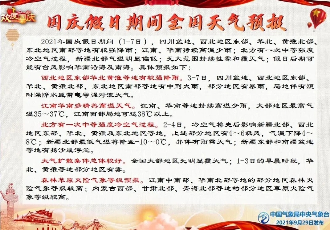 2021年国庆假日期间多冷空气活动,气温起伏较大。郑州9月30日-10月3日白天,以晴好天气为主。10月3日夜间至8日受副高边缘西南气流和地面冷空气共同影响,将出现大风、降温和持续降水天气。最高气温10月3日为30度,10月7日仅为16度,差不多打了个对折。