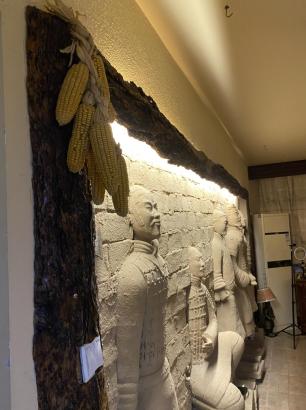就连墙上的贴纸,简单一张白纸糊上去可是不行的,老板也尽量选择的是兵马俑主题
