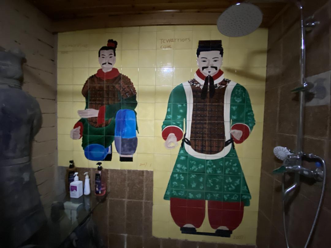 在卫生间的墙壁上,一片一片地贴上了彩绘兵马俑的图案