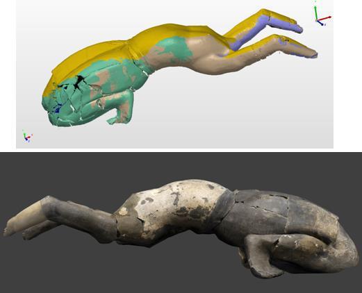 由于28号俑特殊的姿态,即便在修复完成后,也很难直接利用文物本身进行研究和展示、利用工作。为此,秦陵博物院联合西北大学信息科学与技术学院开展了28号俑三维扫描建模工作,利用高精度表面三维扫描和纹理拍照技术,构建了文物的表面和几何形态的高精度建模。使得研究人员和公众可以通过浏览文物的三维模型了解28号俑的姿态和文物的细节。