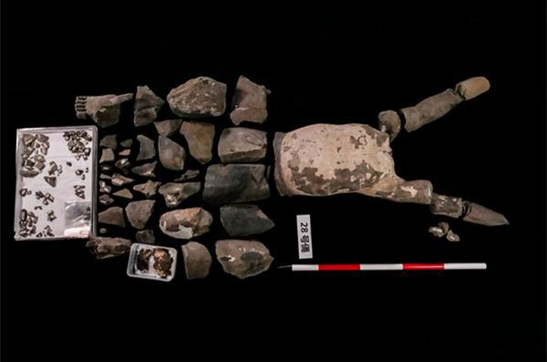 秦陵博物院文物保护部修复专家马宇副研究员介绍,28号俑修复工作第一步是依据陶俑的形态制作支架,测量确定其关键支撑点,在修复现场制作和精准调节支架。28号俑上半身基本完整,下半身残破较严重,先对下半身小块陶片进行拼对,再进行上半身整体的拼对。