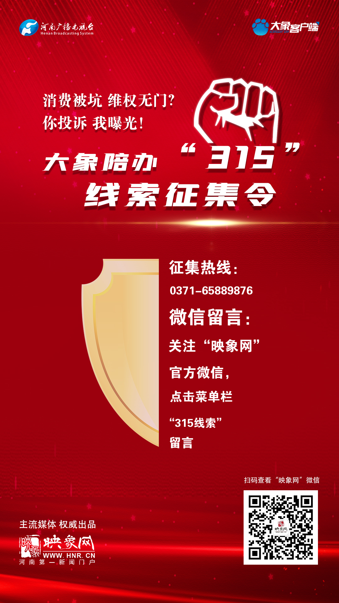 在一年一度的“3.15消费者权益日”来临之际,《大象陪办》发出“315线索征集令”,如果你正遭遇消费时的“糟心事”,请按照以下方式来向我们爆料:
