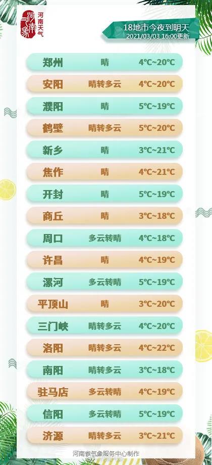 今天白天,晴天。今天夜里,晴天转多云。偏南风3级。最低温度:4到5℃;最高温度:20到21℃。