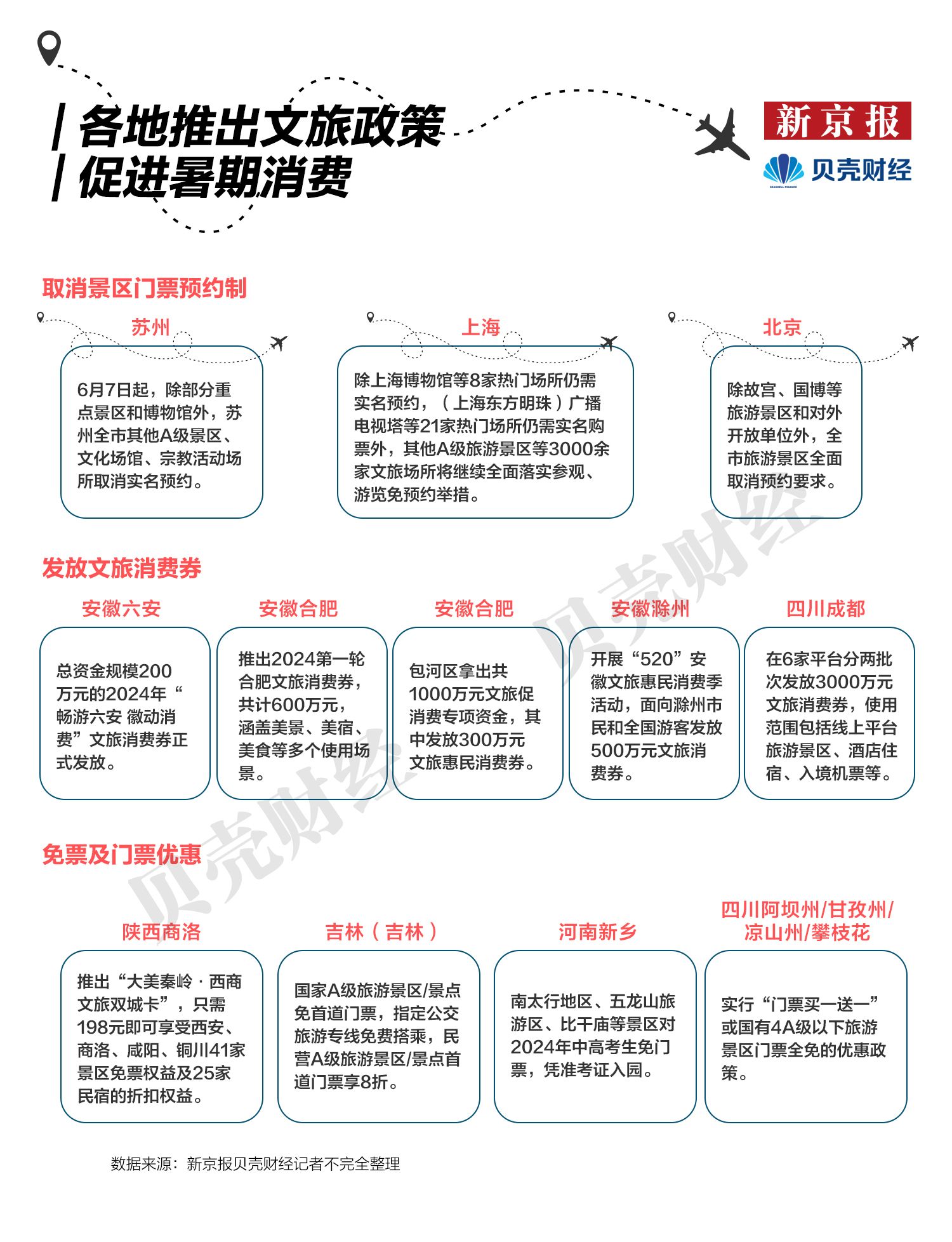 今年以来持续发力的各地文旅,在暑期持续“卷”政策促消费。6月开始,各地区从省级、市级层面纷纷推出暑假期间的针对性优惠措施与文旅活动计划——广东各大景区和酒店在暑假期间推出系列福利,包括免票和降价活动;贵州省发布“多彩贵州”夏季文旅推广优惠政策,包括景区免票优惠,全国大中小学生(含港澳台)可享受全省国有A级景区门票免费优惠;安徽省文化和旅游厅联合全省16市推出四百余条暑期研学旅游优惠政策和公益活动,诚邀省内外学生体验研学旅游;陕西省推出夏季暑期“凉夏计划”及优惠措施。