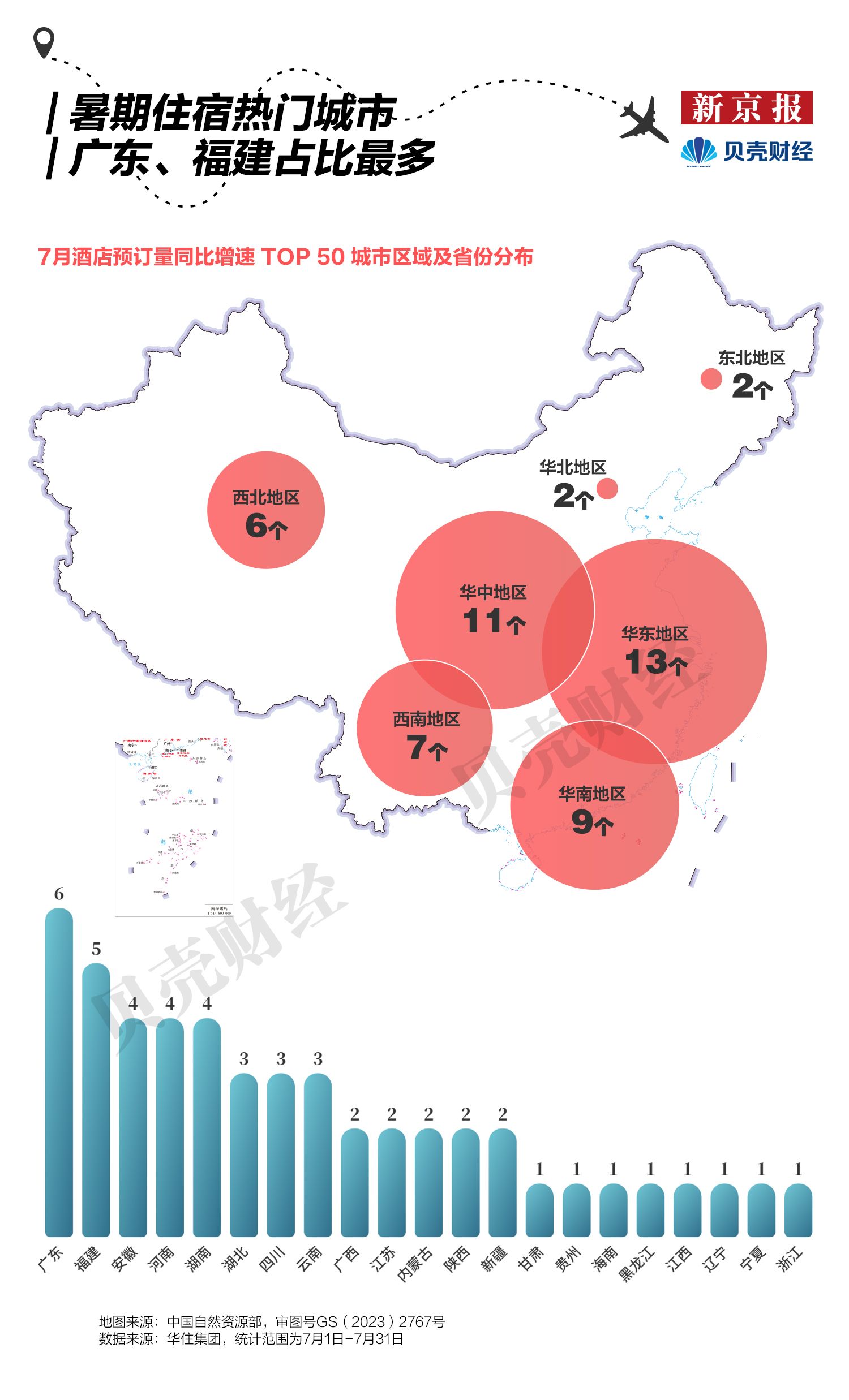 从区域分布看,7月酒店预订量增速前50城市主要分布在华东、华中、华南地区,其中华东、华中区域城市数量分别为13个和11个。按省份划分,50个城市共分布在全国21个省份,暑期住宿热门城市数量最多的省份是广东省,共6个城市;其次是福建省,有5个城市;安徽省、河南省、湖南省均有4个城市,并列排在第三位。整体而言,暑期酒店预订增速前50城市中,大部分属于南方城市,北方城市共17个。
